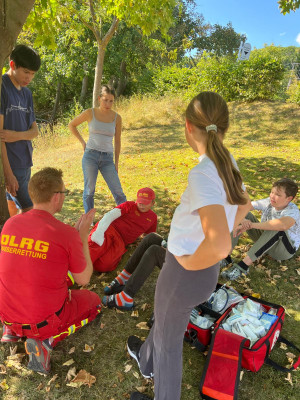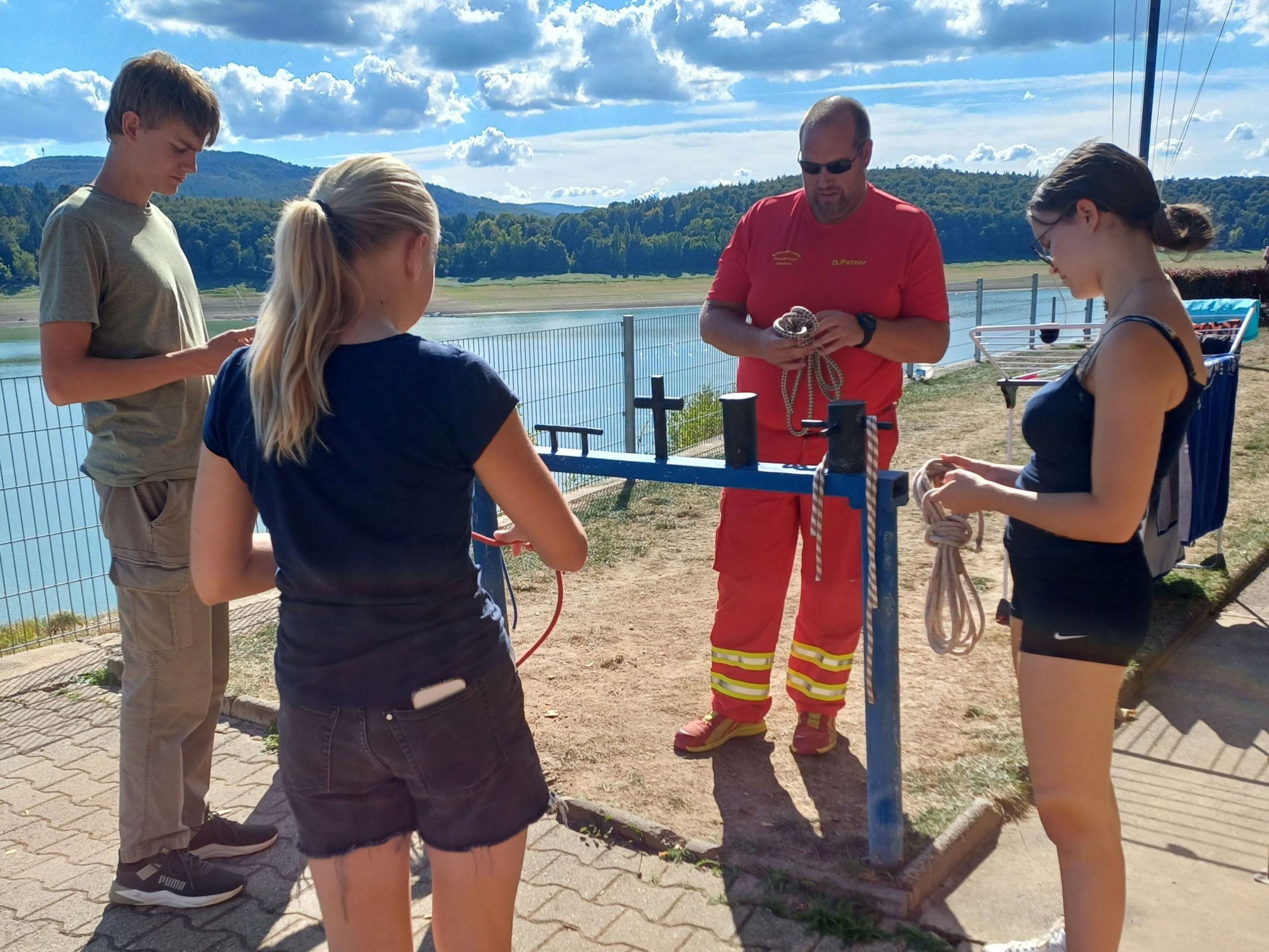 Nach dem Mittagessen folgten die Praxisübungen zu den Themen des Vormittags: In Kleingruppen lernten sie wichtige Knoten und testeten ihr Erste Hilfe Wissen in Fallbeispielen. Anschließend nutzen die Teilnehmenden das schöne Wetter zum Baden im Edersee und hatten dabei viel Spaß zusammen.